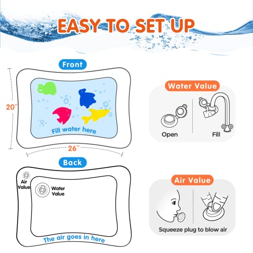 Stimulates baby development, essential early development tool: Sensory and motor development, the soft and comfy inflatable tummy time activity mat is the perfect baby water sensory toy for developing solid head, neck, and shoulder muscles as well as refining the hand-eye coordination, fine motor, and social skills. It is a sensory delight that enhances brain development. Baby grows and gets stronger which encourages your baby to learn to roll over and crawl more quickly.