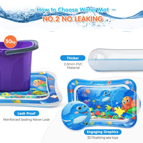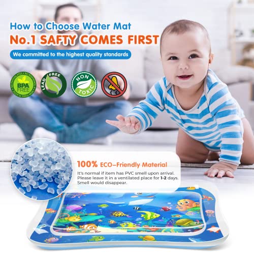 Explore seaworld mat, fun tummy time toy: When the baby comes to the water tummy time mat, he will be attracted by vivid, colorful eye-catching graphics and try to catch or bat the brightly floating sea toys as they float by. This baby water mat will provide hours of quality stimulating and healthy fun on his belly to stimulate visual development and improve eye-hand coordination. It helps you make sure your baby gets enough time on his tummy each day.