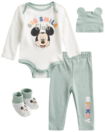 COMPLETE LAYETTE SET: This 3 or 4 piece newborn clothing bundle includes a snug-fitting beanie with 3D ears, a pair of bootie slipper socks for tiny feet, a lightweight bodysuit with a fun Disney graphic, and sweatpants for chilly days; They are all made with extra soft cotton material that will keep your infant warm and comfortable