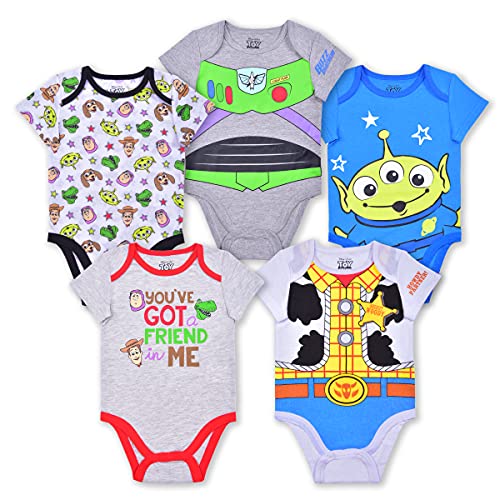 Disney Toy Story Boys 5 Pack Short Sleeve Bodysuit for Newborn and Infant – Blue/Grey/White