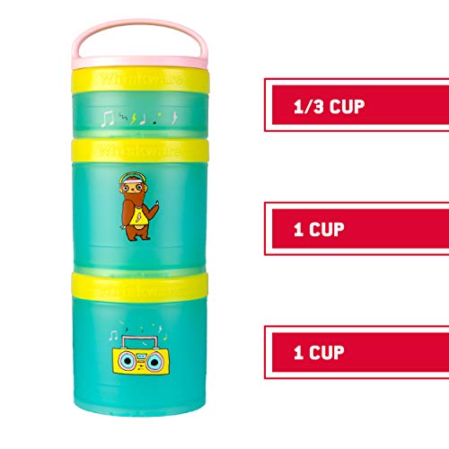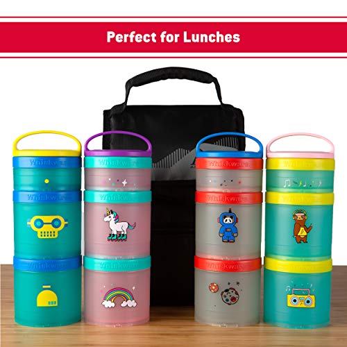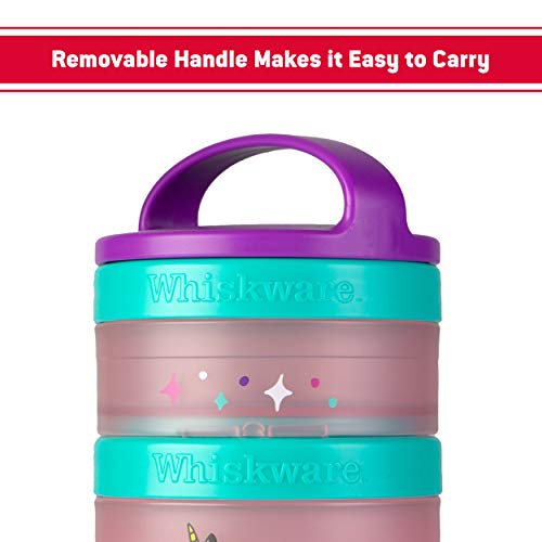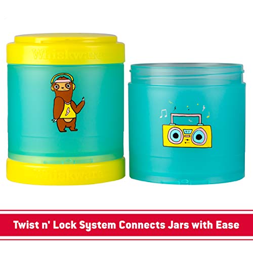 Whiskware Stackable Snack Packs in fun, playful designs! Looking for environmentally-friendly ways to pack healthy, homemade snacks? Versatile, stackable, interlocking containers are perfect for on-the-go snacking or lunches. Each set comes with three dishwasher-safe jars: 1/3 cup, 1 cup, and 1 cup. Jars can be used on their own, or easily connected to each other with the quick-twist Twist ‘n’ Lock system. Removable carrying handle makes it easy to carry the stack, or clip it to a backpack or bag. Perfect for fruits, veggies, crackers, mixed nuts, and toppings. Or, fill them with tiny treasures and toys. BPA- and phthalate-free; dishwasher and freezer safe..