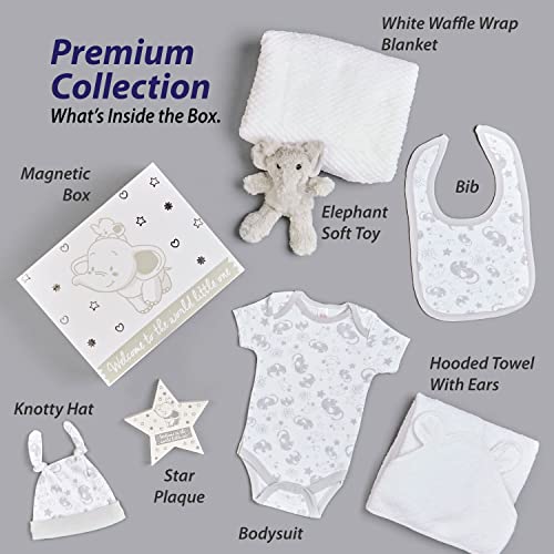 Adorable Selection – This premium unisex hamper collection presented in a beautiful gift box includes a white waffle wrap blanket, hooded towel, sleep suit and hat. A grey elephant soft toy and a star plaque ornament for the baby’s room