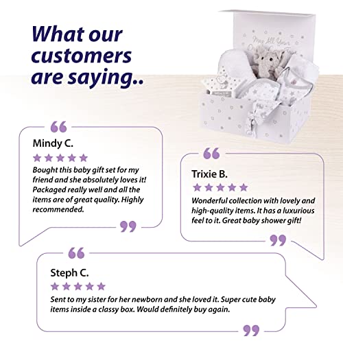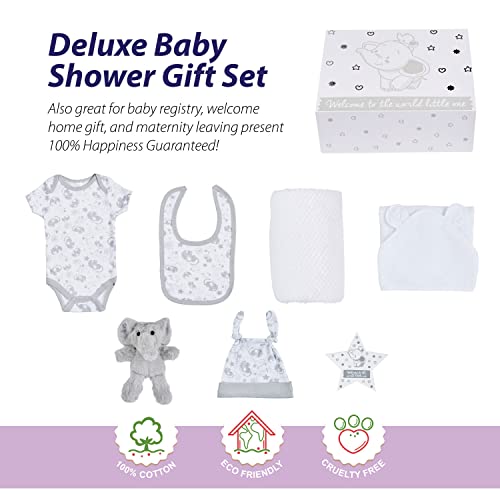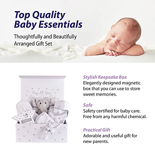 Unisex Baby Gift Set – Unique Magnetic Box That Includes a Wrap Blanket, Hooded Towel, Soft Elephant Toy, Bib and Hat. A Great Shower Gift for New Baby Boys and Girls