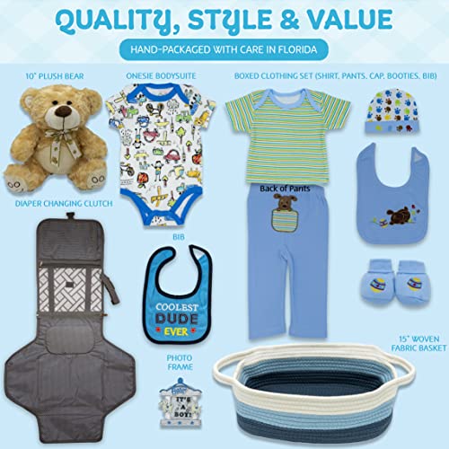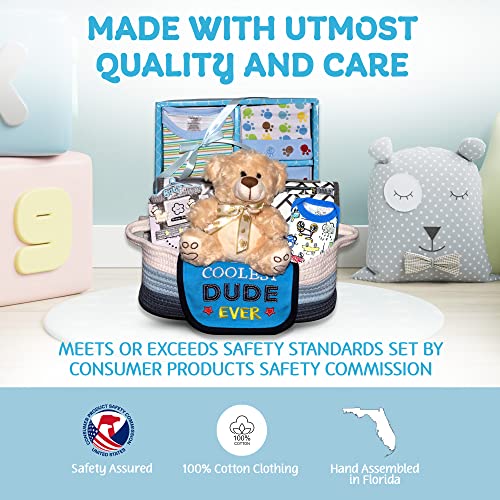 Made with Utmost Care and Quality – Our unique new parent and baby boy shower gift set is carefully sourced and hand-assembled in our Florida factory. All baby items are lab-tested to ensure quality, and they meet or exceed all safety standards set by the Consumer Products Safety Commission.