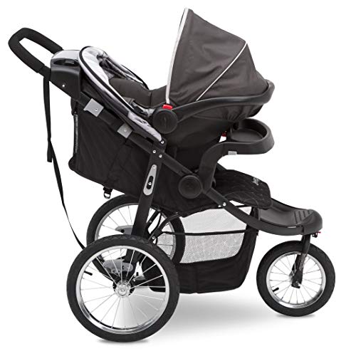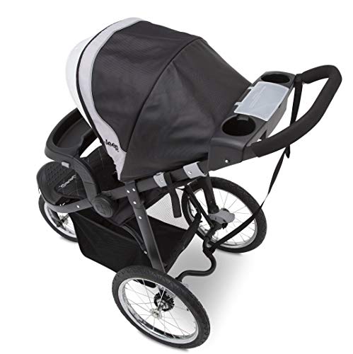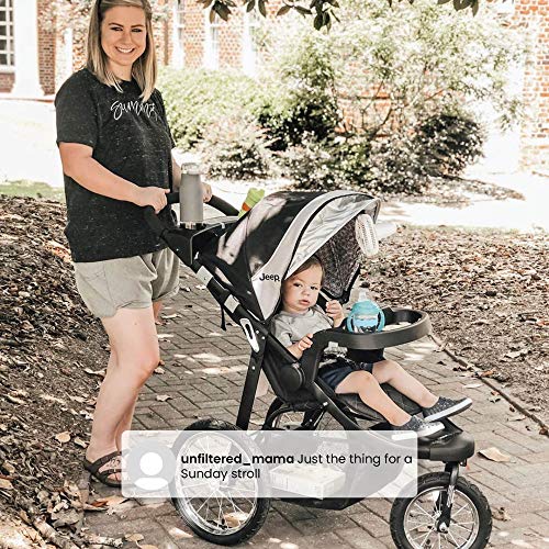 Designed for on-the-go parents and ever-growing babies, the Jeep Deluxe Patriot Open Trails Jogger by Delta Children makes it easier than ever to run errands (or laps!) with your child. This jogging stroller accepts a number of popular infant car seats with a secure attachment to create your own travel system. An all-terrain jogging stroller with an ultra-sleek look, it features cool pops of color, high-tech fabrics and chic, silver spokes that ensure it expertly blends fashion with function. Ready for anything, the stroller has swivel front wheel for maximum maneuverability–lock the front swivel wheel in place for jogging and unlock it for low speed strolling. The jogger’s wide ergonomic handle bar is easy to grab and steer, and comes with a safety tether that easily attaches to your wrist as you jog. To keep your child comfortable as you stroll, it features a reclining seat and extendable European-style canopy with sun visor to protect them from the elements. A child tray that swings up and out allows you to effortlessly load and unload your child while a spacious bin under the carriage, and a convenient parent tray with cup holders and a clear compartment to keep your phone within view and reach provides ample storage space. To make storing or transporting stress-free, the stroller folds quickly and compactly, and the back tires can be easily removed to stow away into your trunk. Holds up to 50 lbs./ 42″.
