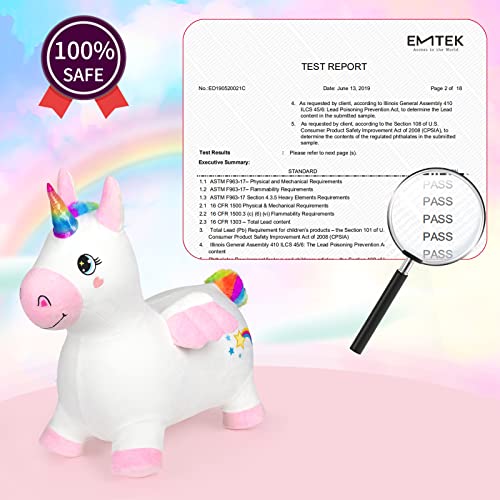 【UNICORN PALS】Inflatable hopper is covered with soft, removable, and easy-to-clean plush. As a member of the family, the bouncer unicorn is made of safe, odorless, thickened, and durable material. Protect your kids and brings infinite happiness. : Easy to grip and kids can stay stable on the hopping horse made of anti-slip material. Contains no US banned phthalates and heavy metal elements. BPA free-conforms to the safety requirements of EU EN71, US CPSIA & ASTM F963.
