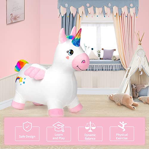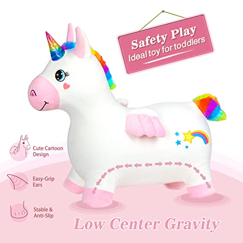 INPANY Bouncy Unicorn Horse Plush for Toddlers – Bouncing Horse Hopper, Ride on Animal Toys for Girls Boys, Inflatable Riding Gifts – Plush Covered (Include Pump)